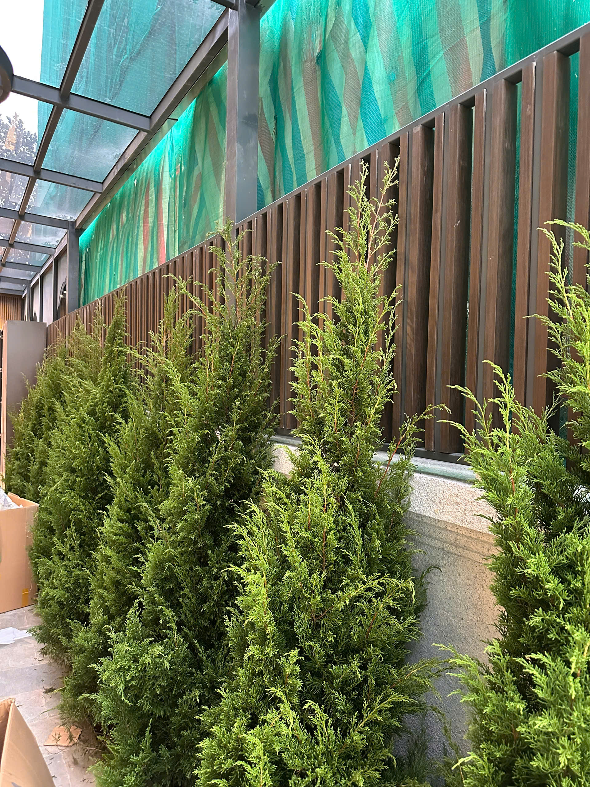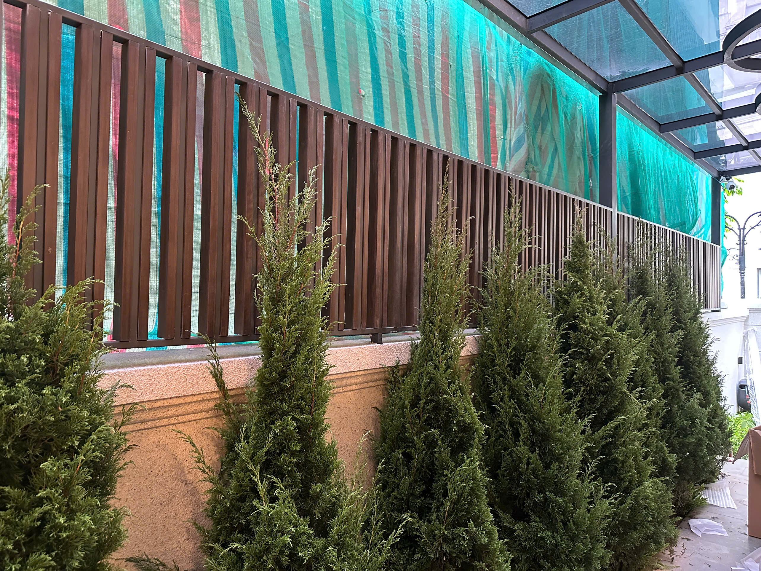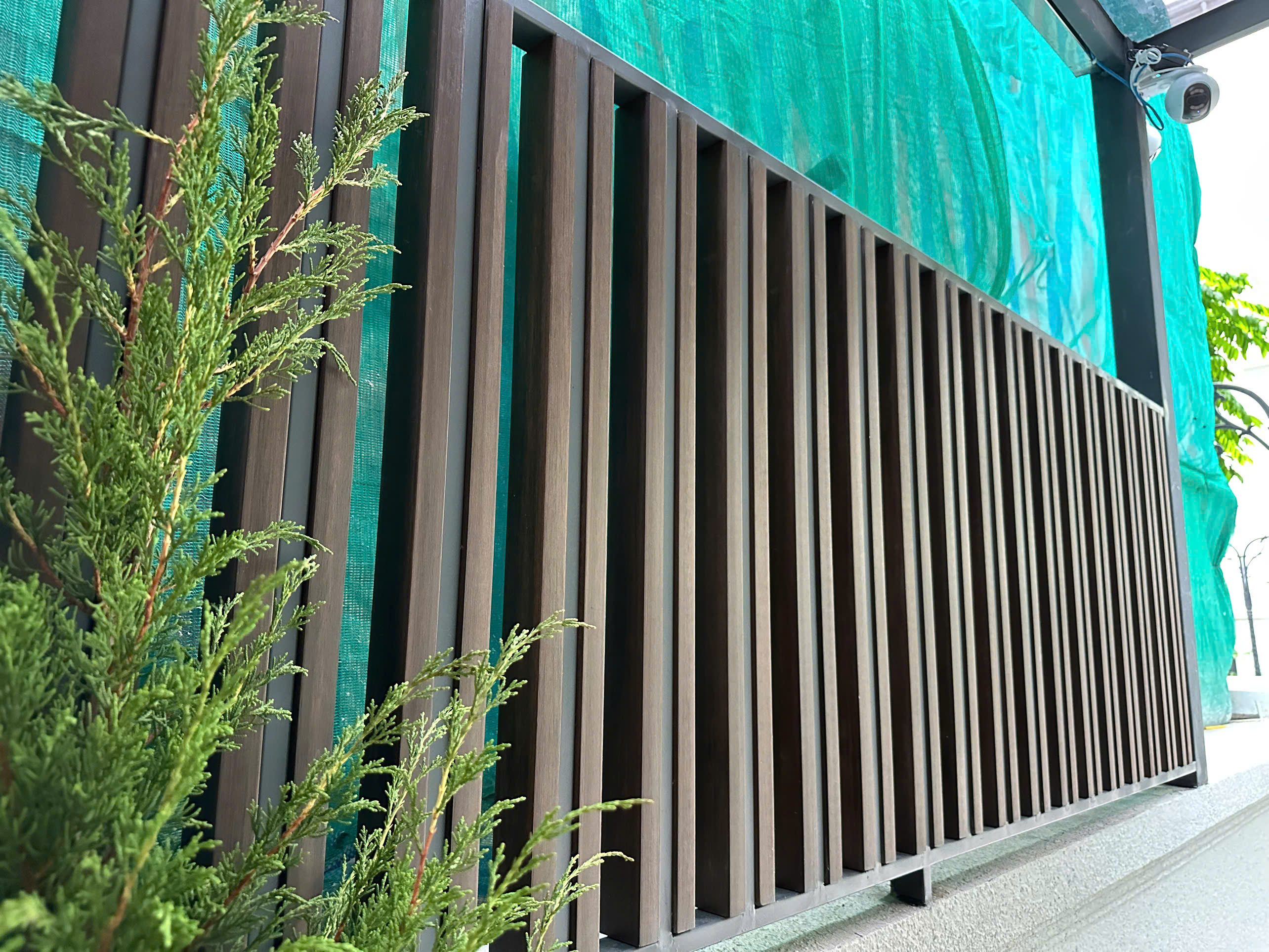 Hàng rào trang trí (lam chắn nắng), sử dụng thanh gỗ nhựa ngoài trời mã FSO-5025CD, kết hợp kẹp giữa thép hộp 20*40mm.