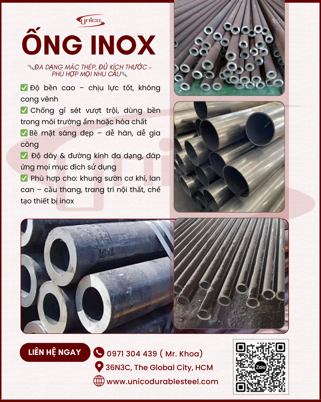 ỐNG INOX UNICO – ĐA DẠNG MÁC THÉP & KÍCH THƯỚC CHO MỌI NHU CẦU