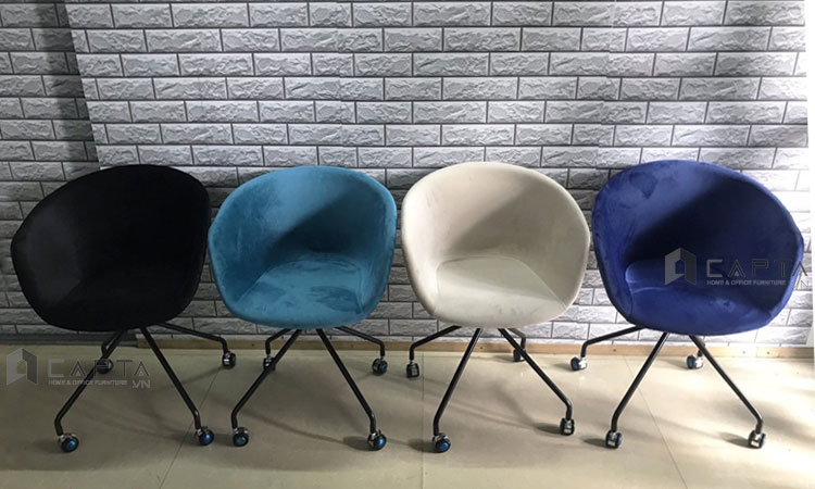 Thân ghế chất liệu vải nhung (Xanh ngọc, Kem, Tím, Đen) cao cấp, thiết kế bo tròn đường may đẹp tỉ mỉ tinh tế, màu sắc sinh động kết hợp khung chân sắt sơn tĩnh điện màu đen sang trọng thanh mảnh nhưng vô cùng chắc chắn, thiết kế chân ghế có bánh xe dễ dàng di chuyển trong khu vực làm việc.