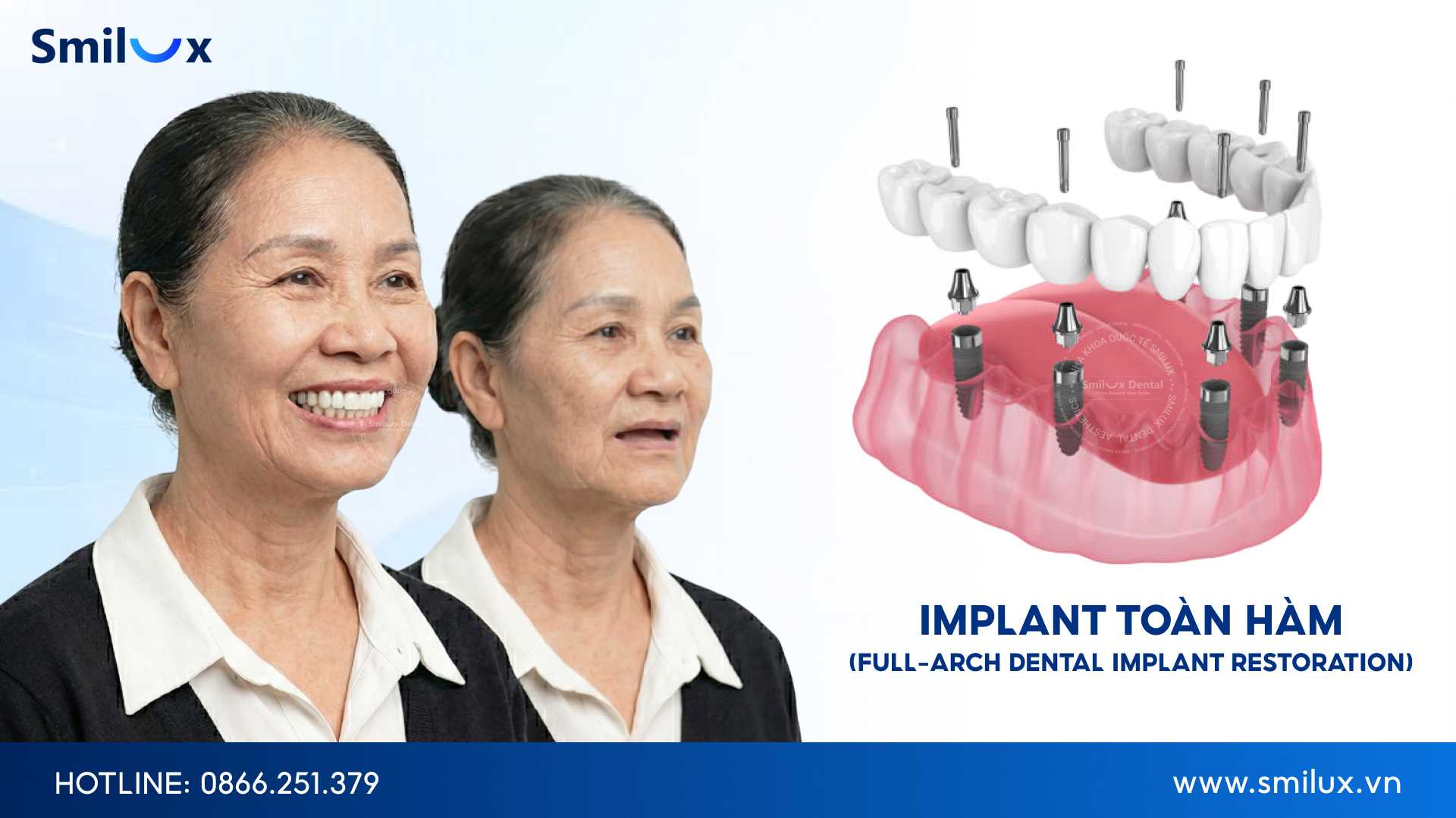 Trồng răng Implant toàn hàm là giải pháp hiện đại giúp phục hồi toàn bộ răng đã mất chỉ với số lượng trụ Implant tối ưu, từ đó nâng đỡ một hàm răng cố định chắc chắn. Phương pháp này đặc biệt phù hợp với người mất răng toàn hàm lâu năm, người đang sử dụng hàm tháo lắp nhưng gặp tình trạng lỏng lẻo, đau nướu, ăn nhai kém hoặc thường xuyên rơi rớt khi giao tiếp.