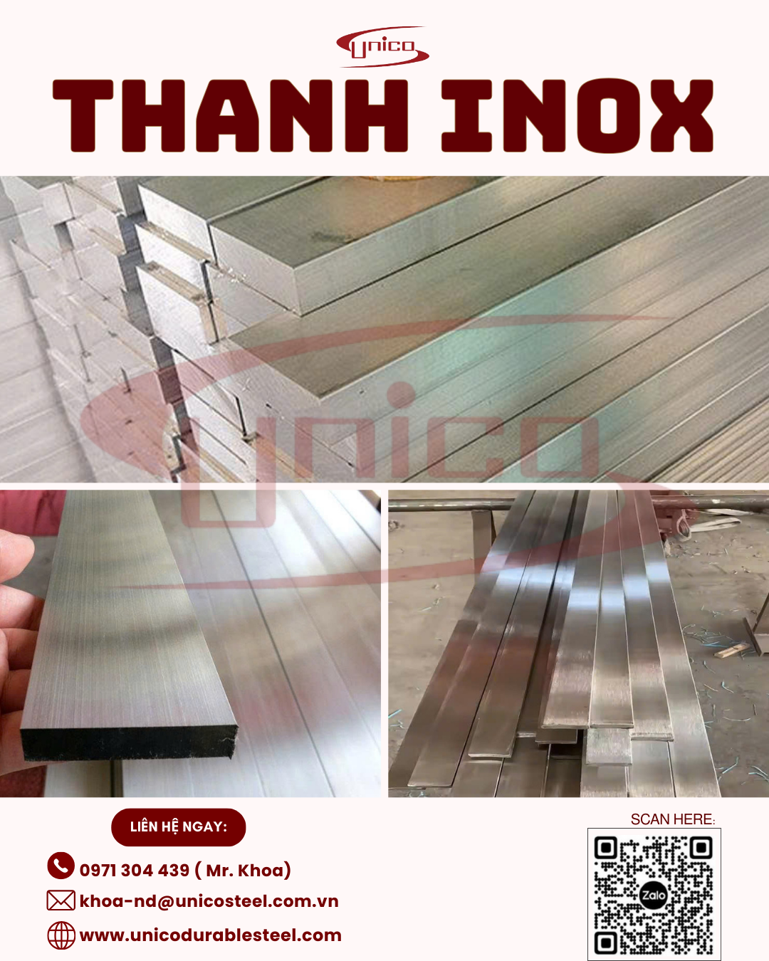 UNICO STEEL nhận cung cấp thanh inox đặc – phẳng – la theo yêu cầu, đa dạng mác inox và quy cách, tư vấn đúng kỹ thuật, cam kết CO/CQ đầy đủ, hỗ trợ lâu dài.